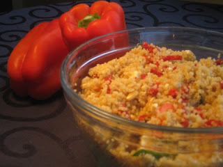 Make 1 ½ cups of quinoa with 3 cups of water. Quinoa is made similar to rice—the way you know it is ready is when you see the germ circles around the grains. Slice fresh spinach, dice bell peppers, chop red onions and add ½ cup of each to the grain. Add ½ cup of sun dried tomatoes and add 1 tablespoon of the oil from the jar.